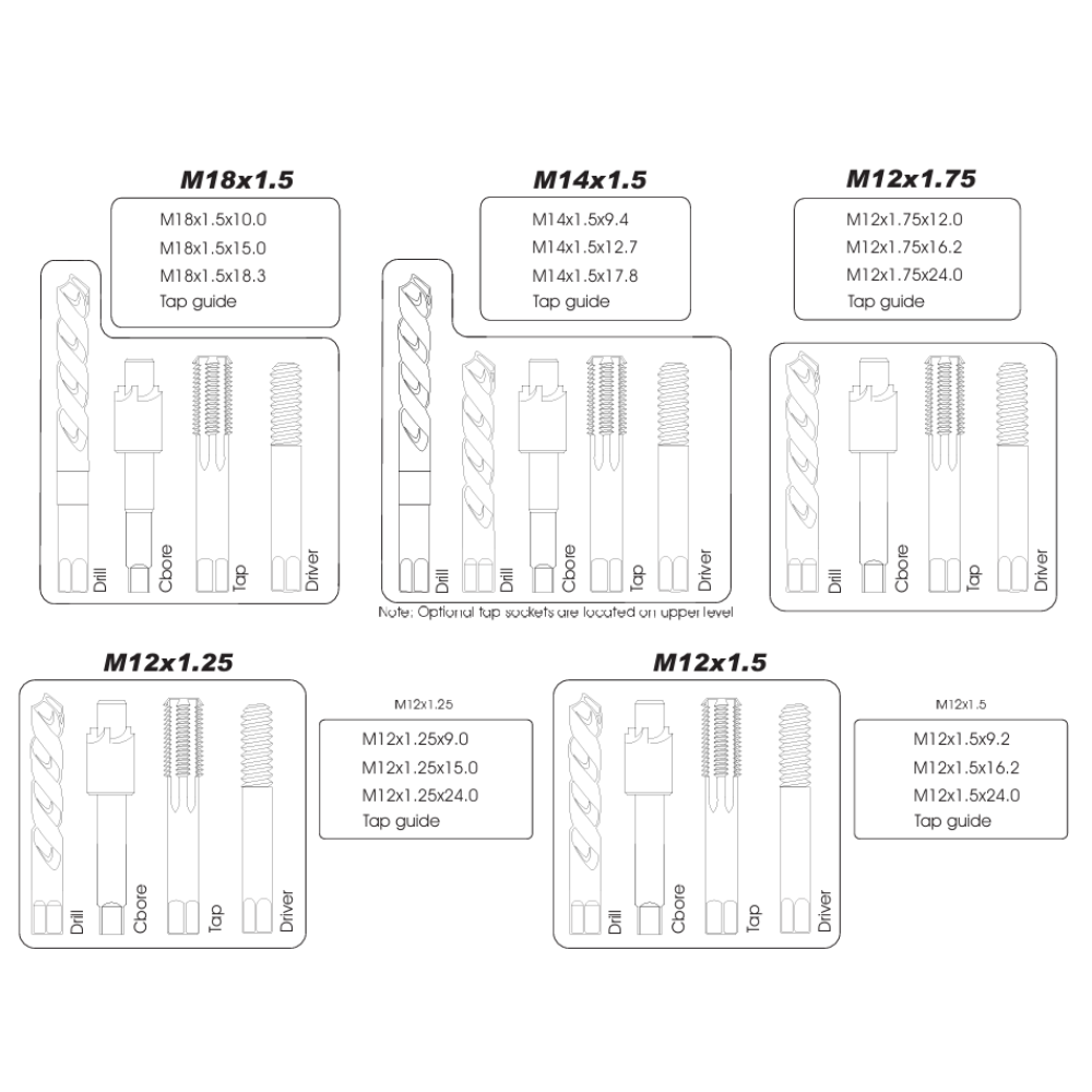 Each kit includes the drill, counterbore, thread cutter tap, tap guide and insertion tool for complete installation. Includes 1 x driver oil.